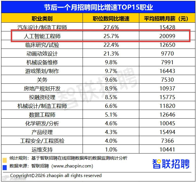 2026年春招数据显示,人工智能工程师平均月薪达到2万/月,职位数同比增速高达25.7%,高薪的同时迎来了需求的持续爆发!