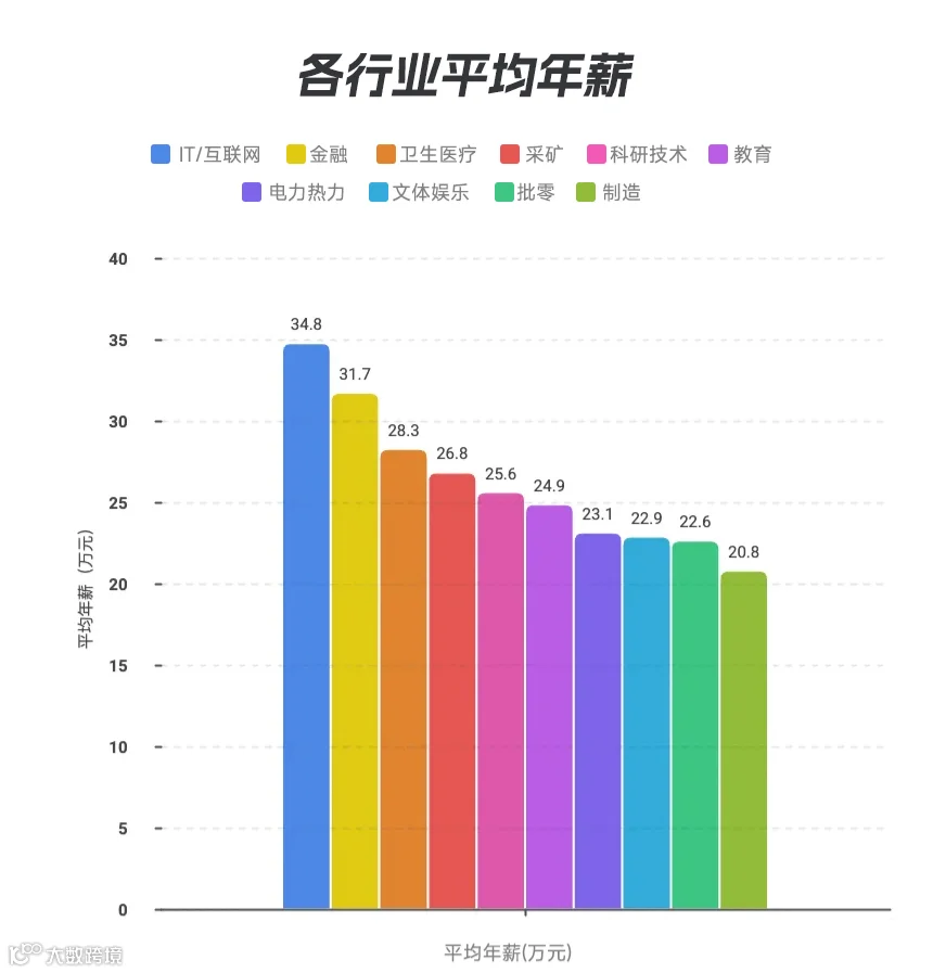 根据最新行业薪资数据,IT/互联网行业以34.8万元的平均年薪领跑全行业。