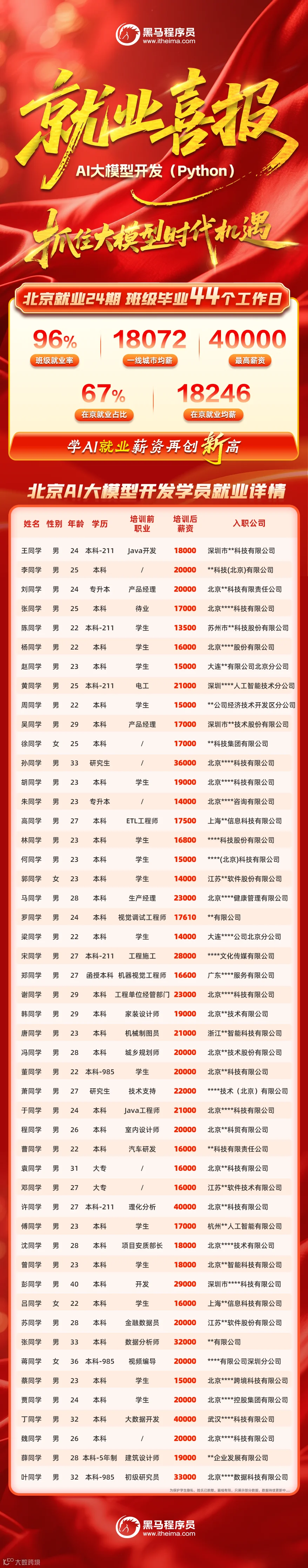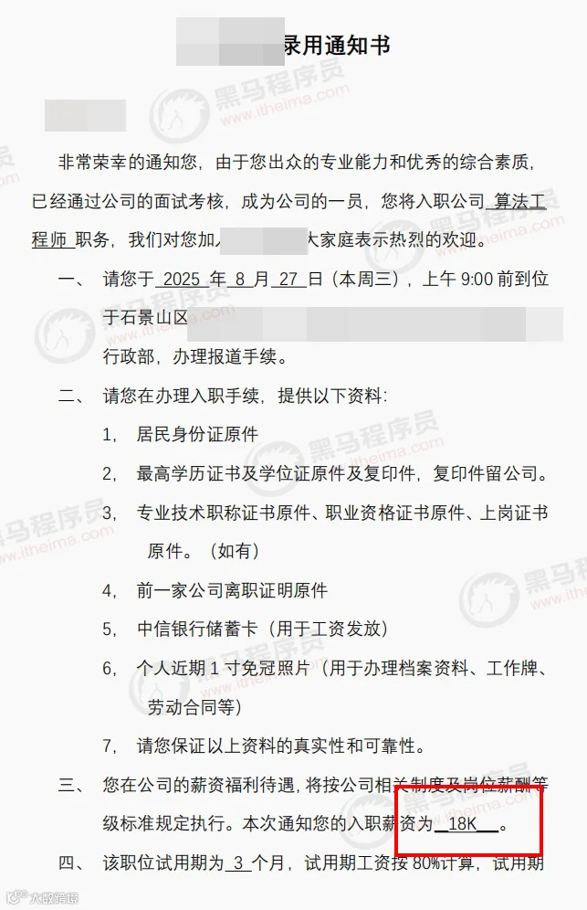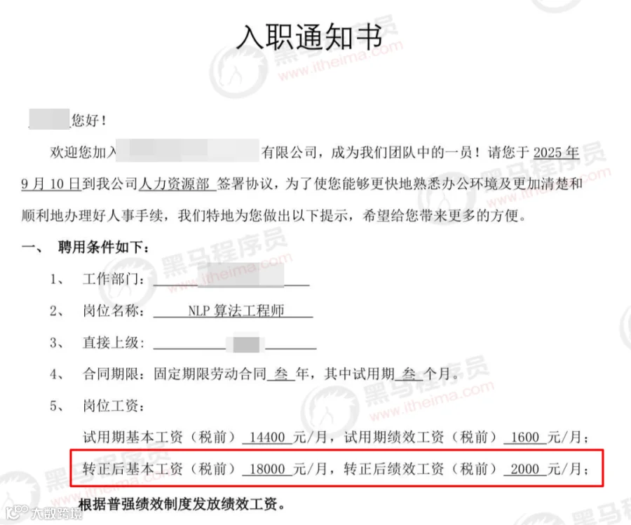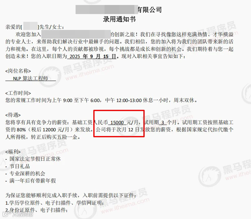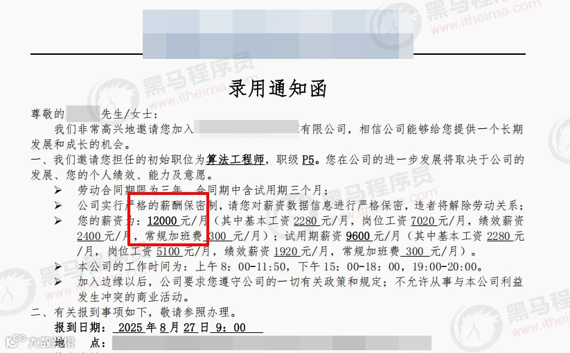 在黑马学生中,既有初出茅庐的应届毕业生,也有寻求转型的职场人。通过来黑马系统学习AI课程,他们顺利实现高起点就业。