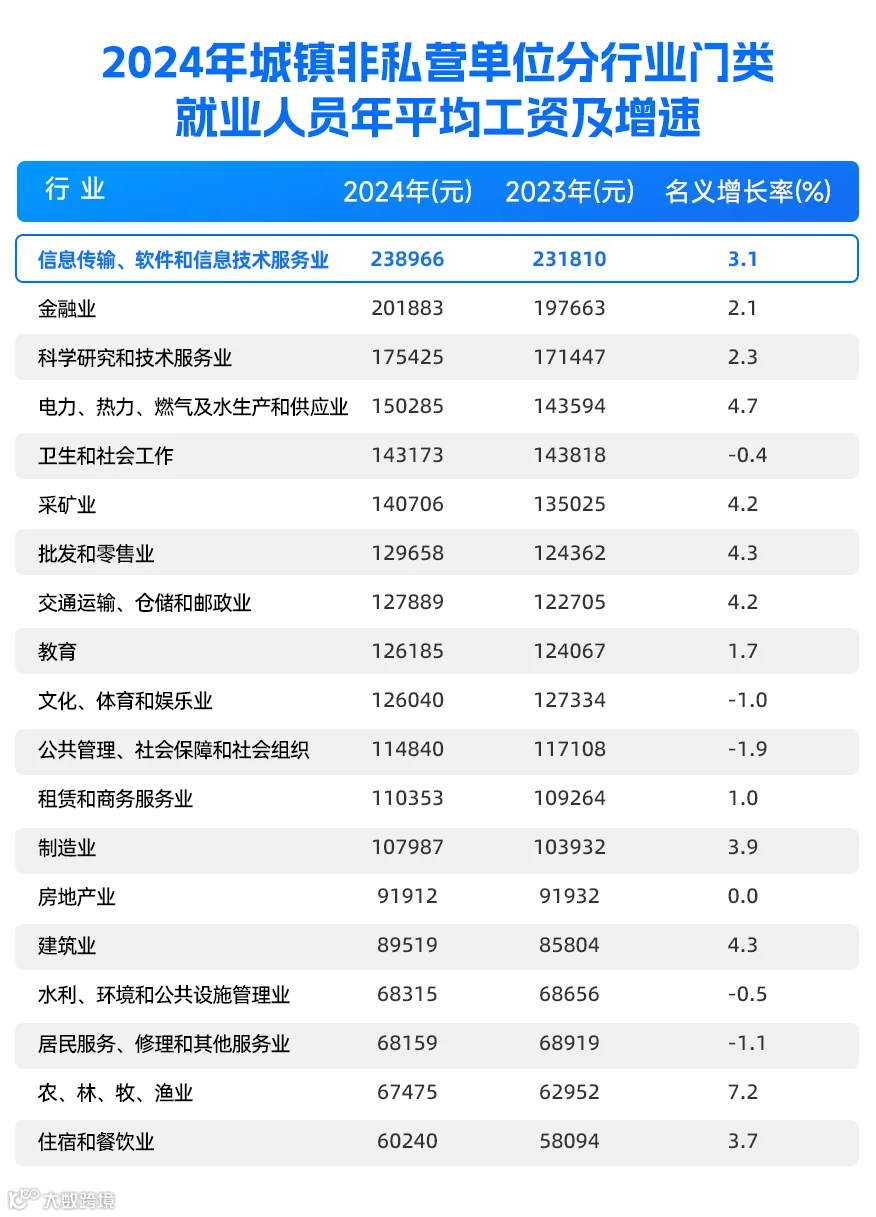 据统计,在2024年城镇非私营单位分行业门类就业人员年平均工资数据中,IT行业、金融业、科学研究和技术服务业三个行业名列前三,其中IT行业平均薪资高达 238966 元,遥遥领先其他行业!并且已经连续 9 年保持领先!