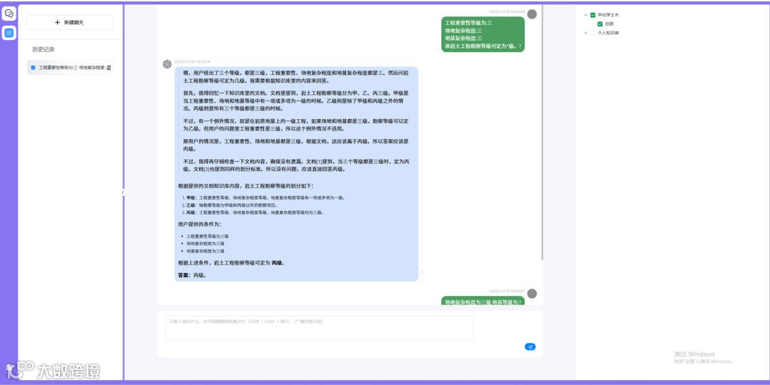 已完成岩土勘察报告知识库及问答系统功能的前后端开发。用户对大模型进行提问,系统会根据问答内容自动生成结果,并标明出处,基本满足使用要求。