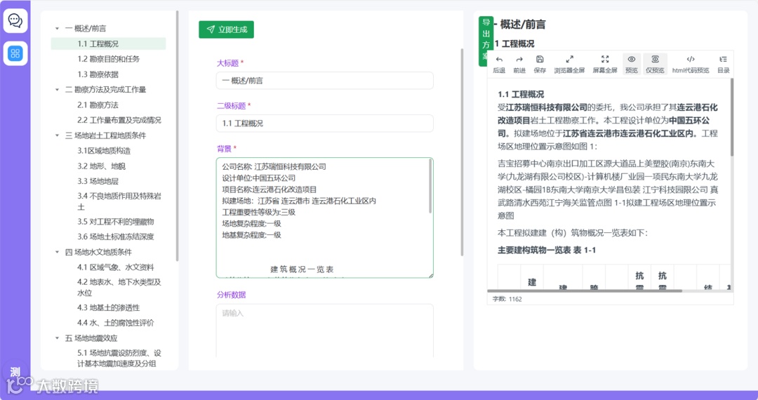 系统已集成智能报告分段生成与编辑功能,用户可通过界面输入各节主题、关键参数与工程特征,大模型将基于输入内容进行智能整合与语言优化,自动生成符合行业规范的段落文本。同时,系统支持生成内容的逐段编辑、版本管理与模板复用,实现报告内容的个性化定制与高效编制,为工程人员提供智能化、结构化的报告撰写工具。