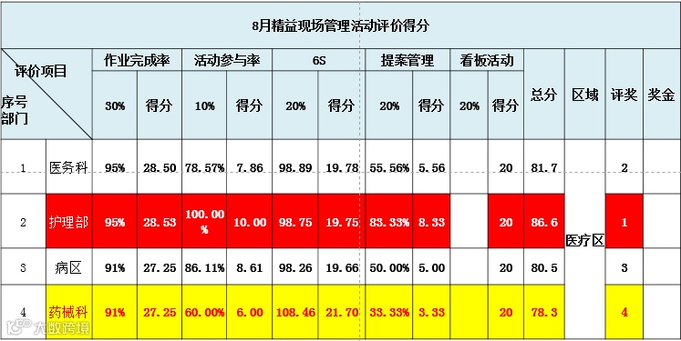 随后,迅速实施样板区复制,将医院划分为行政后勤和业务两大区域,共九个样板区,实现全院覆盖,全员参与,现场6S管理进展得如火如荼。
