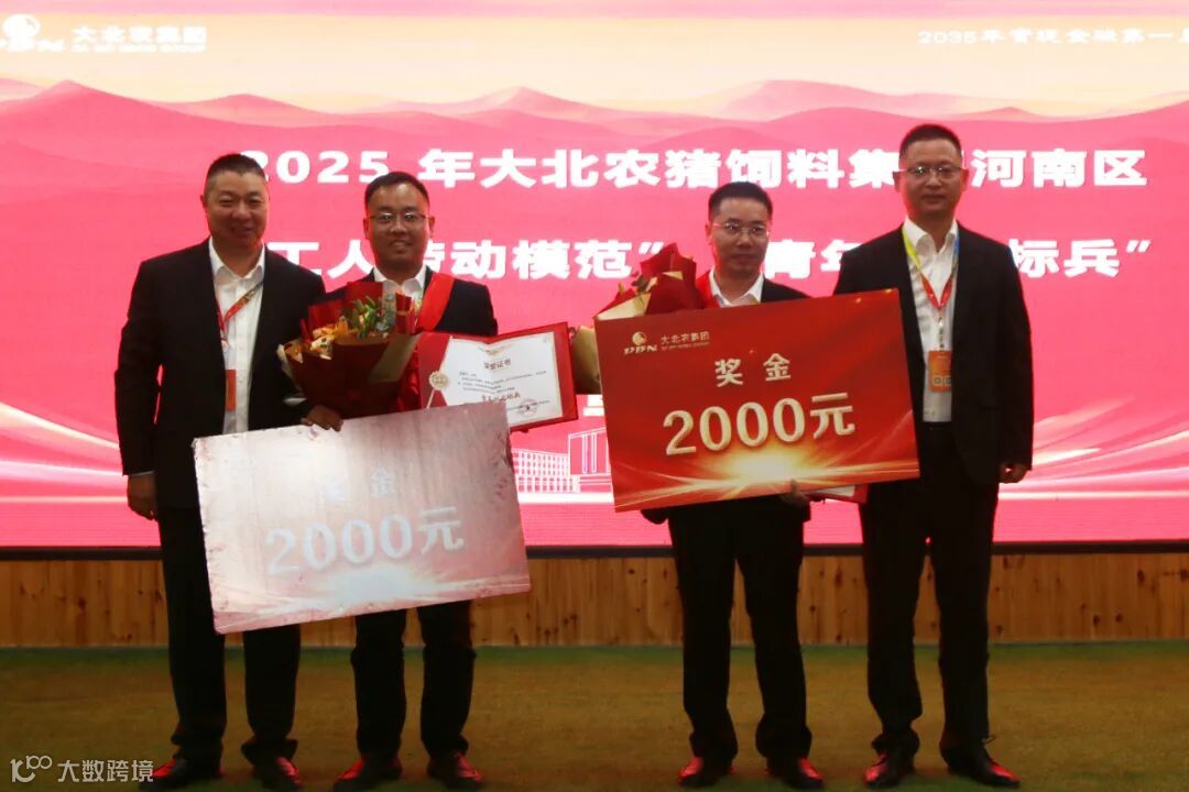 弘扬劳模精神,践行青年担当。河南区总裁王杰老师和副总裁翟钦辉博士为荣获“2025年度大北农集团劳动模范及青年创业标兵”的刘新生老师和王成飞老师颁发荣誉证书和激励金,全体创业者以榜样力量为引领,点燃加速度发展新动能,共启创业新浪潮。