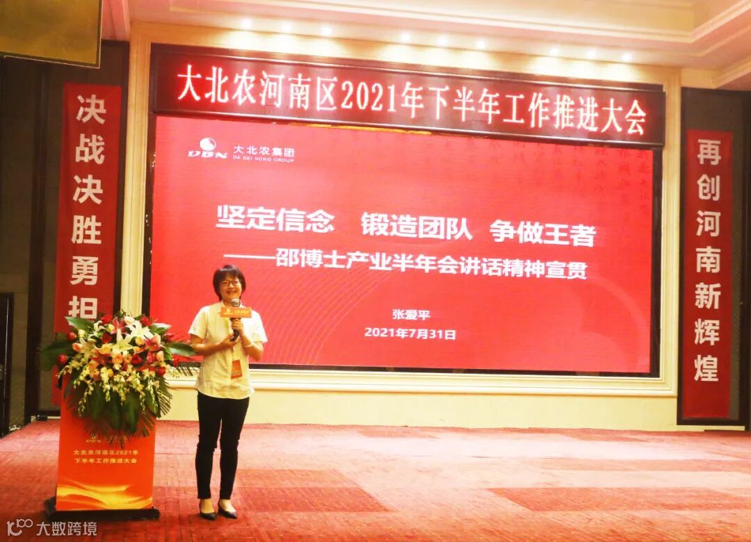 大北农集团总裁助理/创业大学常务副校长/文化纪律部总监张爱平老师以《坚定信念 锻造团队 争做王者》为题进行分享,简要介绍了桂林会议的基本情况,重点对邵博士讲话精神进行宣贯赋能,号召大家要树立强烈的紧迫感、机遇感,重视人才建设,强大队伍,坚决执行"三高"策略,优化工厂布局,实现河南区辉煌战绩。河南区全体战将在张老师的鼓舞下,坚定必胜信念,坚决打赢下半年攻坚战。