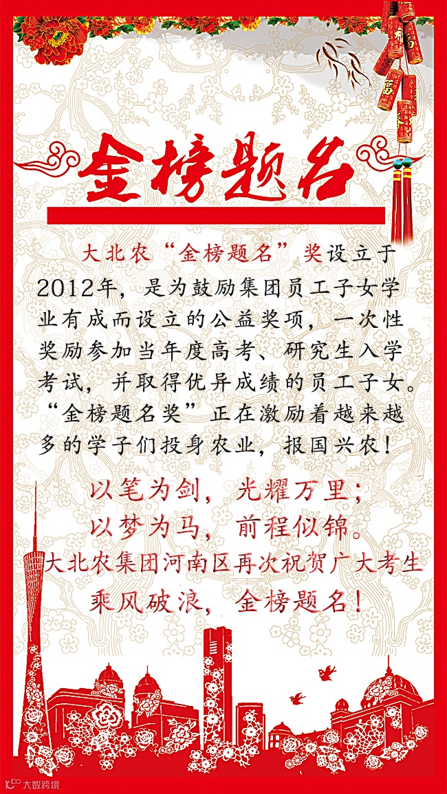 十年寒窗苦泛舟,终得梅花扑鼻香。大北农河南区再次对以上荣获“大北农集团金榜题名奖励”的优秀学子表示热烈的祝贺,望他们在今后的学习生涯中永争第一,用优异的成绩来回报父母、报效国家。