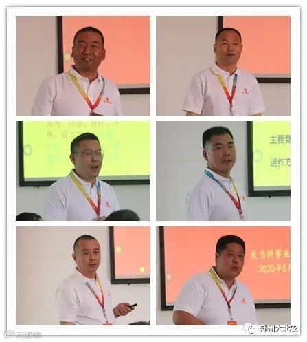 王海平、朱贵勋、李永阁、李含、陈永胜、范开六位老师分别代表河南区猪配合料、猪预混料、动保、禽预混料、禽配合料、反刍饲料事业部就市场状况、2020年1-4月份工作进展及5-12月目标规划等进行分享。