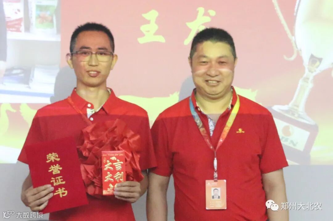 王龙老师荣获大北农河南区2020上半年动保销售冠军奖,王杰老师对其进行了颁奖。比学赶帮超永争第一,河南区动保团队斗志昂扬。
