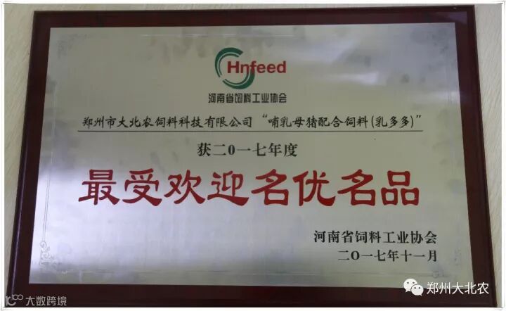 2017年11月19日,以“共享‘饲路’,豫见未来”为主题的2017·河南省饲料工业协会年会暨饲料行业创新发展年度峰会在河南郑州举办。郑州市大北农饲料科技有限公司“哺乳母猪配合饲料(乳多多)”荣获2017年度“最受欢迎名优名品”。