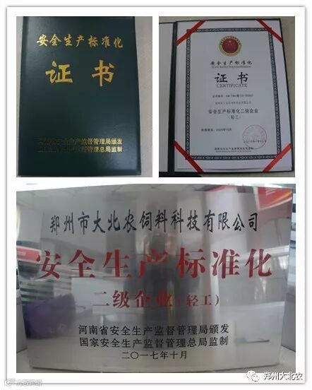2017年6月13日,郑州大北农特邀省安检局相关专家对公司的标准化复评工作进行了外部评审。2017年10月,郑州市大北农饲料科技有限公司顺利通过“安全生产标准化二级企业”,并取得了河南省安全生产监督管理局颁发的证书和牌匾。