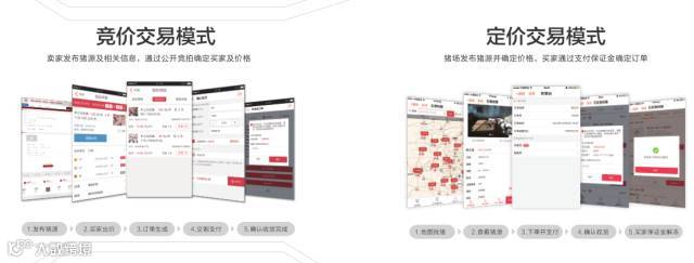 竞价模式从步骤来讲,有五步:卖家挂单→买家出价→生成订单→交割生猪→完成订单。卖家发布出来供买家竞价的生猪的计量单位是“XX头/车”,卖家在挂单时,设置一个保护价,当竞价结束时,买家的出价低于该价格时,不能生成订单。竞价模式备受大型养殖场、生猪贸易商及屠宰场等知名企业青睐,针对大型规模猪场可减少中间环节的利润损失,平台之前的定价模式积累了大量的买家,可转化成竞价模式买家。