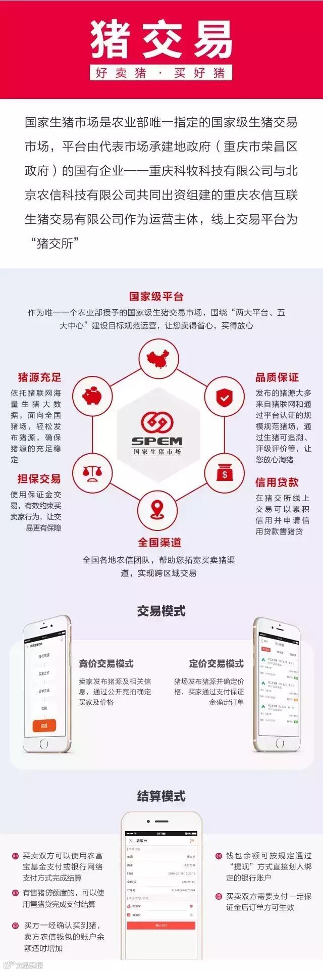 好卖猪,买好猪。让专心养猪的人卖上好价钱;给贸易商、屠宰加工产业提供一个优质的猪源平台,给踏实做事的人提供一个更方便、更先进的平台。国家生猪市场-猪交所颠覆传统交易模式,破解猪周期难题,与更多生猪优势产区合作,共建新的、可持续的生猪生态环境,引领整个生猪产业良性发展。我们相信猪交所的出现代表着我国生猪产业正在翻开全新的历史篇章,让我们一起见证这一切的发生!