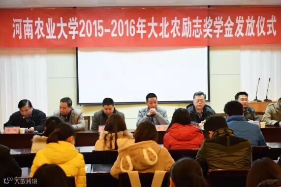 2015年12月23日,大北农励志奖学金颁奖仪式在河南农业大学大礼堂100人报告厅隆重举行,大北农集团农牧科技产业河南特区总经理邢尧、副总经理兼销售总监王杰、预混料豫西北事业部总经理葛军付、河南特区郑州科技园人力资源主管孔庆雨、人力资源专员周玮阳,牧医工程学院副院长宁长申、牧医工程学院副院长李明、牧医工程学院团委副书记来卓及一百余名学生参加了颁奖仪式,会议由牧医工程学院团委书记冯晖主持。