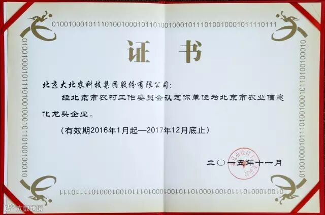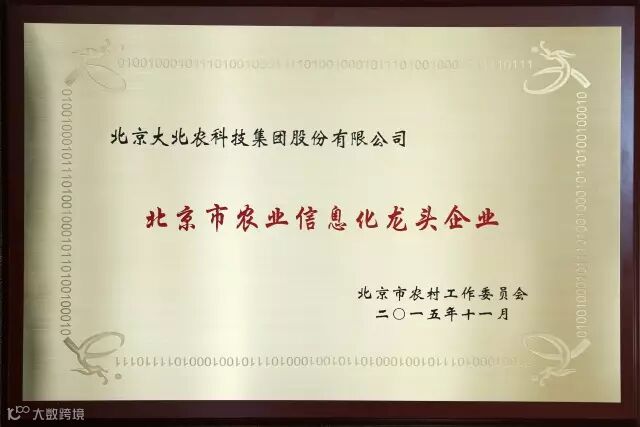2016年1月13日,在北京会议中心举行的“北京市‘互联网+农业’大会暨北京农业互联网联盟成立大会”上,北京大北农科技集团股份有限公司等53家企业被北京农委授予“农业信息化龙头企业”荣誉称号。同时,集团旗下北京农信互联科技有限公司与北京京东世纪贸易有限公司、北京顺鑫控股集团有限公司等全市63家农业互联网企业成为首批“北京农业互联网联盟”成员。