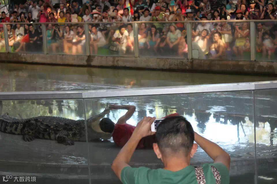 从曼谷前往芭迪雅的途中,我们参观了龙虎园。抱着鳄鱼合影实在是一个惊心动魄的记忆。不大的场地,公园里的工作职员拽着鳄鱼的尾巴,把鳄鱼从水池里拖到地面,这个丑陋凶猛的家伙居然一点也不敢反抗,扭着屁股又往回窜,于是又往抓。据说鳄鱼嘴巴合起来的气力据说能够达到2吨。假如被咬,真是不敢想象。