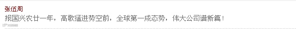 在听完邵博士《实现全球第一 迈向伟大公司》报告后,余佐伟老师踊跃上台分享了参加年会所汲取的正能量,表达出了大北农河南将帅们的心声——建成大北农中原集团!为集团进军2015全球第一完美献礼!
