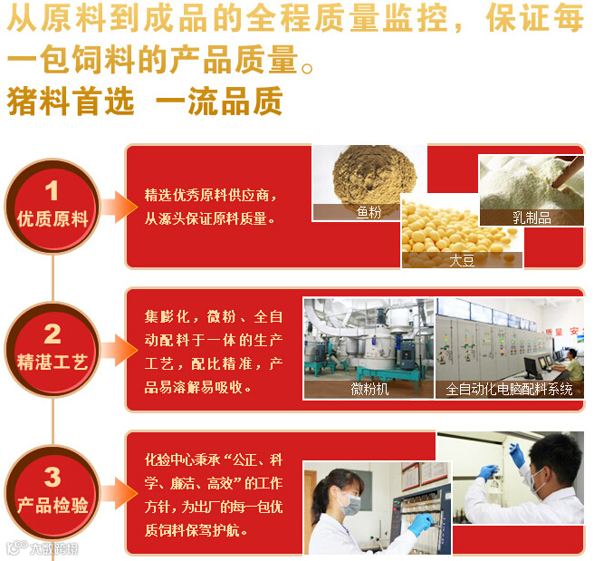 4.原料组成:维生素及类维生素、矿物元素及其络(螯)合物、氨基酸、氨基酸盐及其类似物、豆油、膨化玉米、膨化大豆、乳清粉、豆粕、鱼粉、葡萄糖、石粉等。