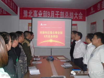 2014年9月28号,大北农河南特区预混料预北事业部在新乡养猪服务中心成功召开“全员冲刺第四季 全面创造新奇迹”为主题的干部总结大会,本次会议展显出了干部转型升级、率先垂范的魄力,为打赢大战役,超额完成目标销量做出了极大的贡献。