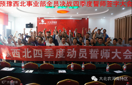 2014年9月29日,河南特区预混料豫西北事业部“四季度动员誓师签字大会”——冲刺四季度,打赢大战役,在沁阳养猪服务中心隆重召开。此次誓师大会以“全员决战四季度 全面创造新奇迹”、“把握机遇 落实策略 率先垂范 坚决打赢四季度攻坚战”为主题口号。河南特区豫西北事业部总经理葛军付老师及豫西北业务、技术、猪场人员、优秀事业伙伴等50余人参加此次会议。