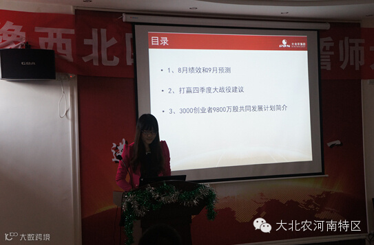 豫西北的领航人葛军付老师为全体业务老师分享总部21-24号新港会议精神和总经办会议精神。葛老师指出“四季度代表着豫西北、河南特区2014年的高度,代表着河南特区2015年的高度”调整全员状态,为打赢四季度的攻坚战加油鼓气。葛老师为大家分析公司动态形势,全集团会议如火如荼的召开,所有体系的会议全面召开,新港召开的动员大会为大北农河南特区持续发展注入强心剂。几个银行连续出手解决资金问题,即使行情不景气,也不能阻碍企业的发展。要求员工要定目标,在1-9月份打下良好基础的前提下,要求全体业务老师在第四季度拼一把!开始业绩冲锋!
