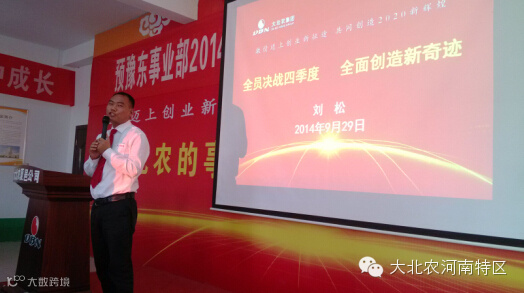 2014年9月28日大北农河南特区预混料豫南事业部”全员奋战 坚决打赢第四季度攻坚战”誓师大会在西平县天隆宾馆隆重召开。大会以”大战役、冲锋在前;打胜仗、独霸豫南”为口号,各项议程紧紧围绕“凝心聚力、全员奋战、坚决打赢第四季度攻坚战”的主题相继展开。预混料豫南事业部全体老师参加了会议。