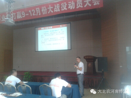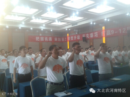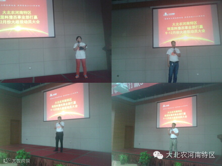 2014年9月1日,大北农集团河南特区以“把握机遇,乘胜而上,转型升级,率先垂范,打赢了9~12月份大战役”为主题,总结河南特区上半年工作同时为2014第四季度大战役做好规划召开誓师大会。预混料豫西事业部打赢大战役誓师大会暨8月份业务总结会议于9月2日在喜度大酒店隆重召开,在所有参会老师在嘹亮的大北农誓词与歌曲拉开了序幕。