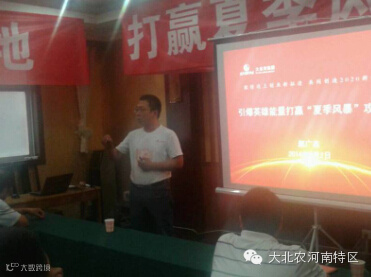 最后由杨新山老师带领大家学习大北农文化并向大家阐述了邢尧老师提出的占领和控制市场不可或缺的三字决“事”“势”“誓”。赵广杰老师重点阐述8月的目标为什么是夏季风暴“攻击”战,而不是夏季风暴“攻坚”战,虽错一字,但是意义却完全相反,由此可以看洛阳巨农的强势的姿态和遇难而上的精神。