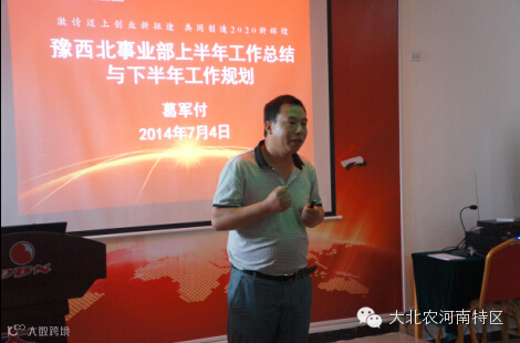 大北农集团河南特区豫西北技术经理李金卫老师,对2014年上半年工作作出总结及下半年计划。李老师对驻区技术人员要求不仅要能看猪病,更要熟悉公司饲料及动保知识,在与客户共同中灵活穿插及应用;要求各位技术老师加强沟通能力,做到人人会讲课;配合业务老师助推业务的发展。针对下半年工作,李老师指出各技术老师配合业务体系从技术角度配合开发猪场及动保产品,对规模化猪场进行培训,人人会讲课深挖找准需求,找出产品切入点开发规模化猪场。