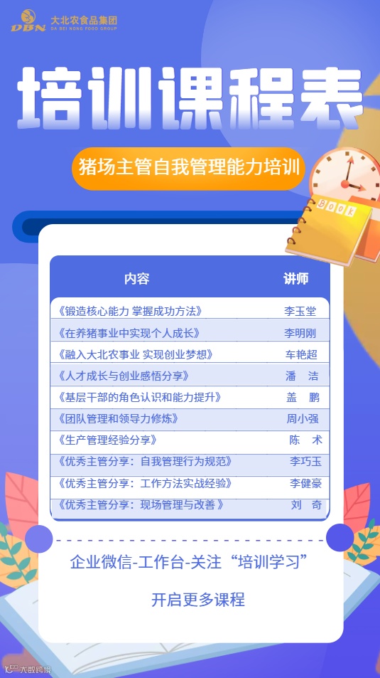 为进一步提升创业者领导力及专业技能,持续增强创业者的企业责任感、认同感,驱动创业者进一步实现个人成长,提升企业竞争力,大北农食品集团将自10月10日起,以线上授课的方式组织开展猪场主管自我管理能力培训!具体安排如下: