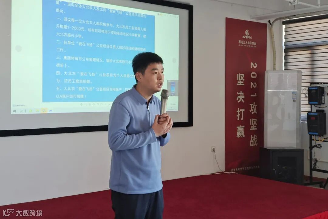 宣贯会议上,大北农食品集团行政管理部经理李欣超老师讲到,大北农自成立以来,便关心、关注青少年的教育与成长。如今的“爱在飞扬”公益项目,也更是希望能够通过全体大北农人的努力,为寒门学子搭建起改变人生的教室,铺就一条通往光明未来的成长之路!能力不分大小,捐款不分多少,善举不分先后,希望大家能够持续关注这项爱心事业,以点滴善举,汇聚成爱的长河,让大北农人的爱心,滋润革命老区孩子的心田!