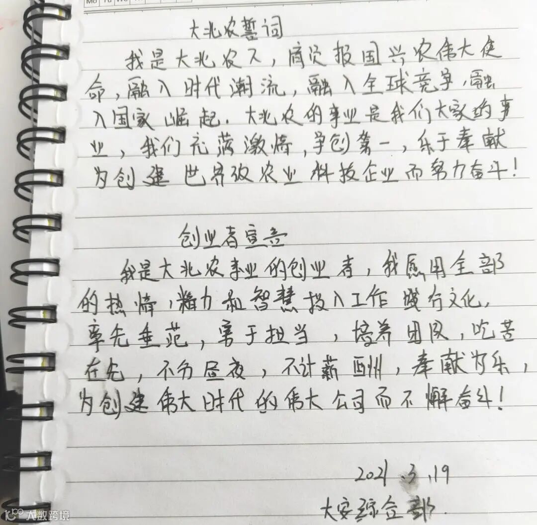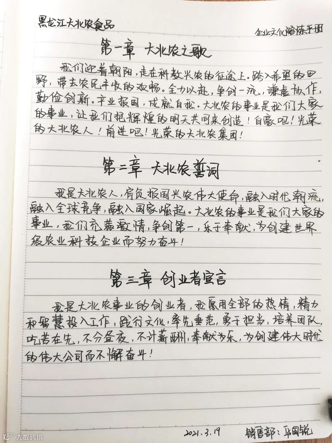 2021年是黑龙江大北农食品第二个五年发展的新起点,为能进一步鼓舞全体创业者学习、践行文化,将思想与行动高度统一,全面落实集团《大北农文化纪律处分条例》,全力冲刺公司2021年“188万头出栏、3000名创业员工、17.5万母猪存栏能力”的全年目标,营造全员战斗氛围,黑龙江大北农食品组织开展了“手抄文化”活动。