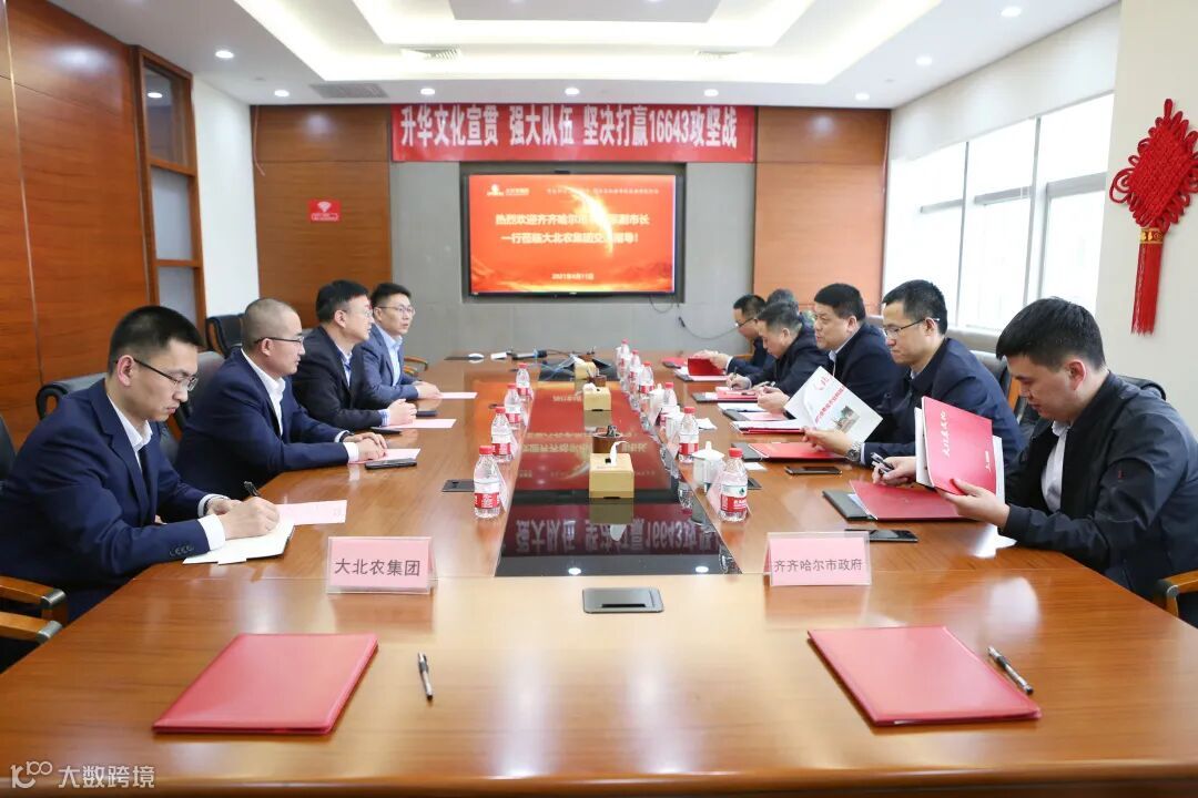 4月11日下午,黑龙江省齐齐哈尔市政府副市长李拥军,齐齐哈尔市富裕县县委副书记、政府县长董加成,市政府五处处长孙大龙,市畜牧兽医局局长李大心等一行莅临大北农集团参观交流。大北农集团高级副总裁莫宏建、黑龙江大北农食品副总裁杨学刚等相关负责人接待。李拥军副市长一行首先参观了农信互联,随后进行座谈交流,双方签署战略合作框架协议。