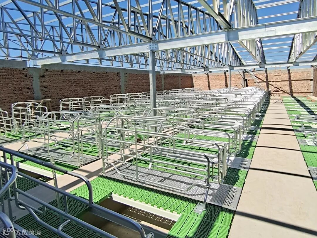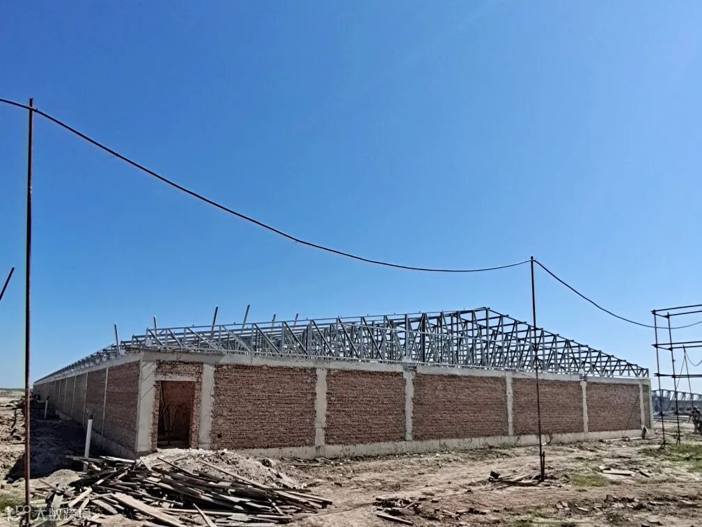 分娩舍1:上圈梁浇筑完成,室内地面地热管铺设完成,漏粪地板开始安装,钢结构开始安装。总体完成60%;