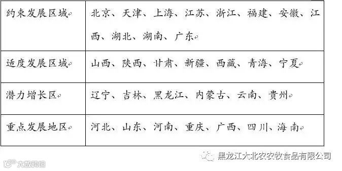 环境容量大地区:潜力增长区(东北4省:辽宁、吉林、黑龙江和内蒙古和云南、贵州两省);重点发展区(河北、山东、河南、重庆、广西、四川、海南7省)。