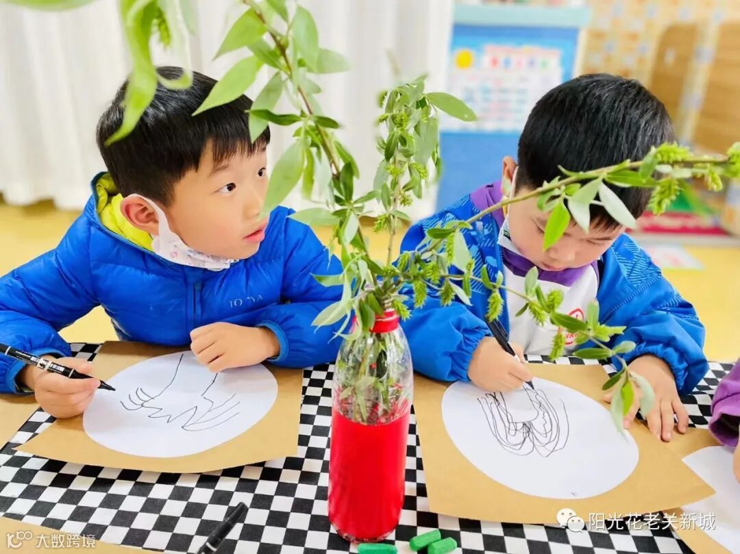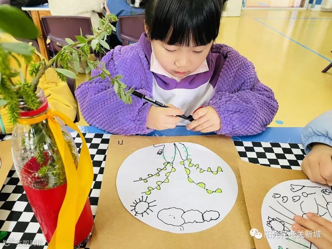 清明节是杨柳发芽抽绿的时间。中班幼儿画柳插柳,观察柳条、柳叶的外形特征,将自己观察到的绘画出来。同时,制作柳条花环,体验清明习俗的趣味。