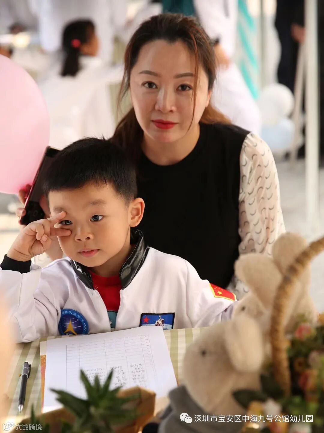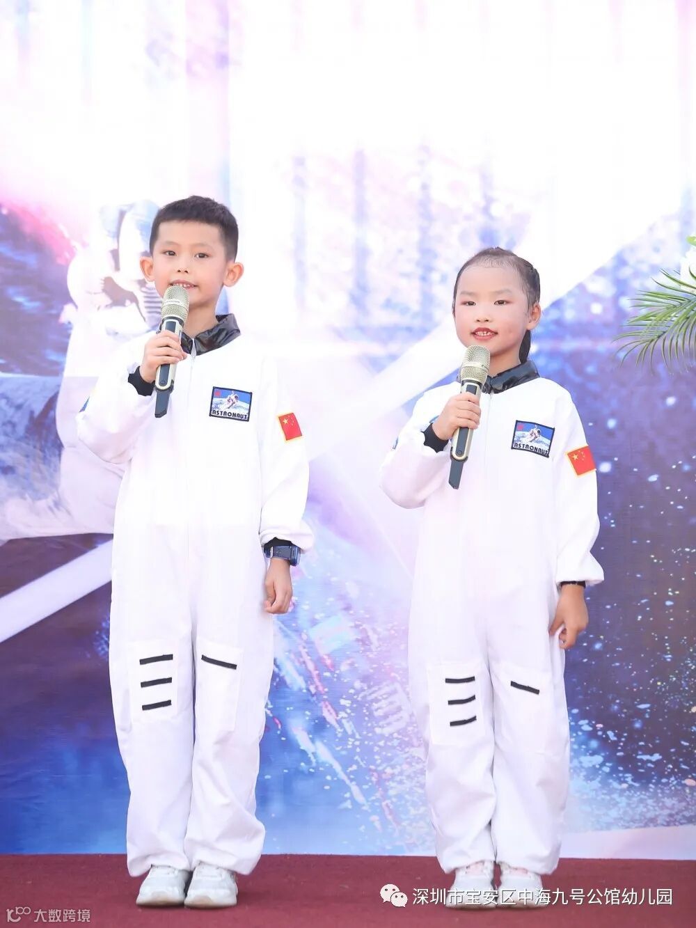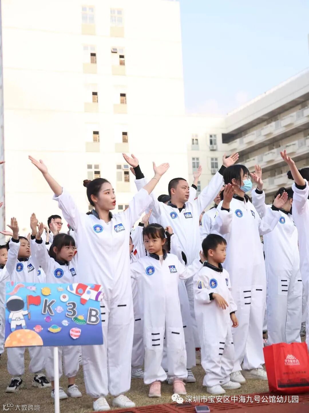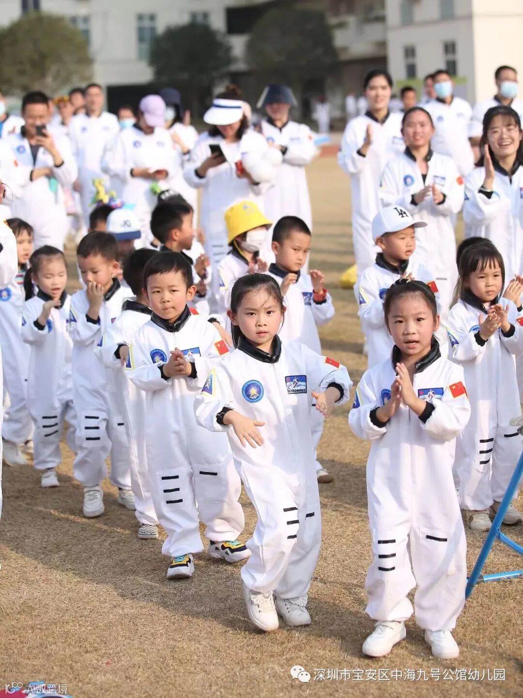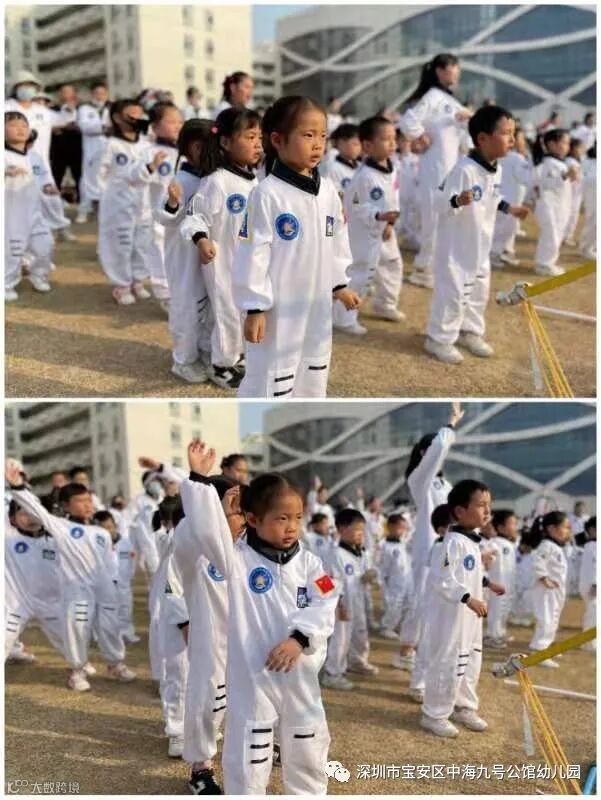 盛装出席的小小宇航员们在爸爸妈妈的陪伴下,个个昂首挺胸、神采飞扬,带着自信的笑容,齐声高喊独特的班级加油口号,依次有序进场。