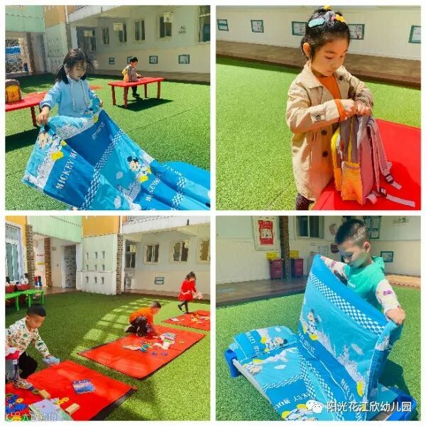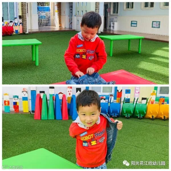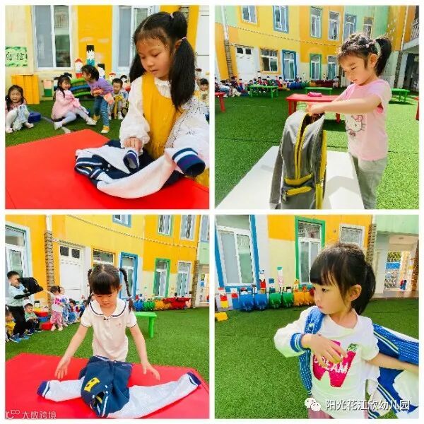 小班组进行了穿鞋子,区分左右脚穿;穿脱衣服;叠衣服,锻炼幼儿的自理能力。