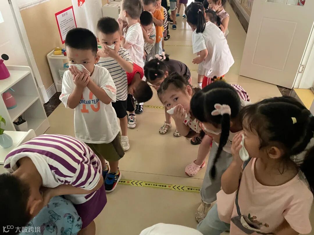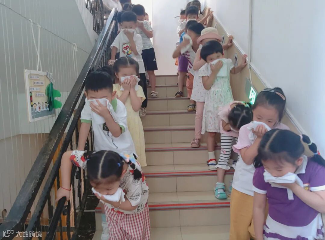 当消防警报声响起时,各班幼儿在老师的引导和带领下,按照安全通道、有序的离开教学楼,集中到操场安全地带。看,孩子们逃生演习时弓着腰,手捂毛巾,动作多规范呀!