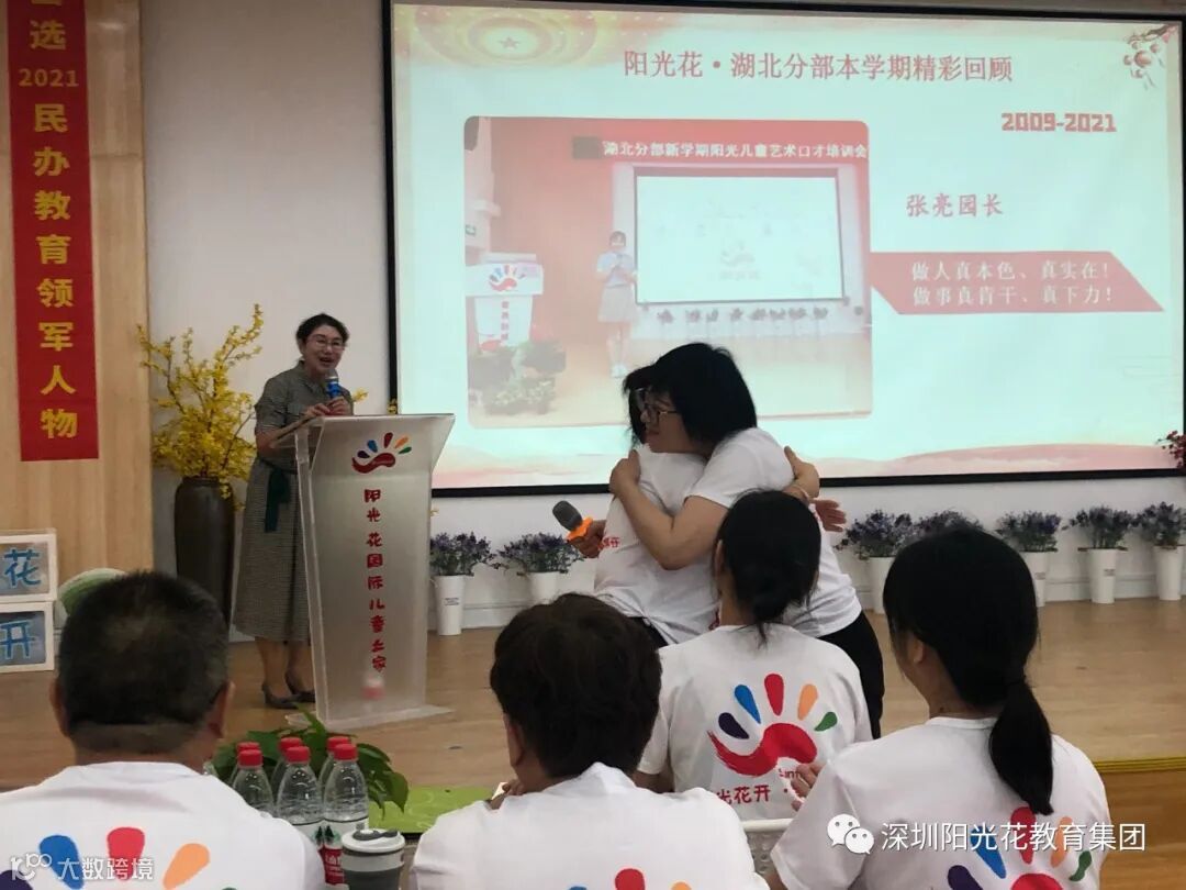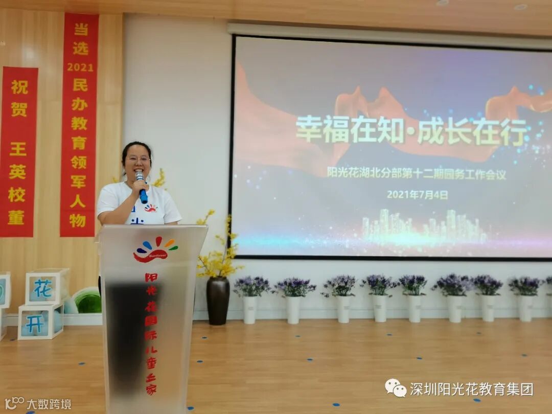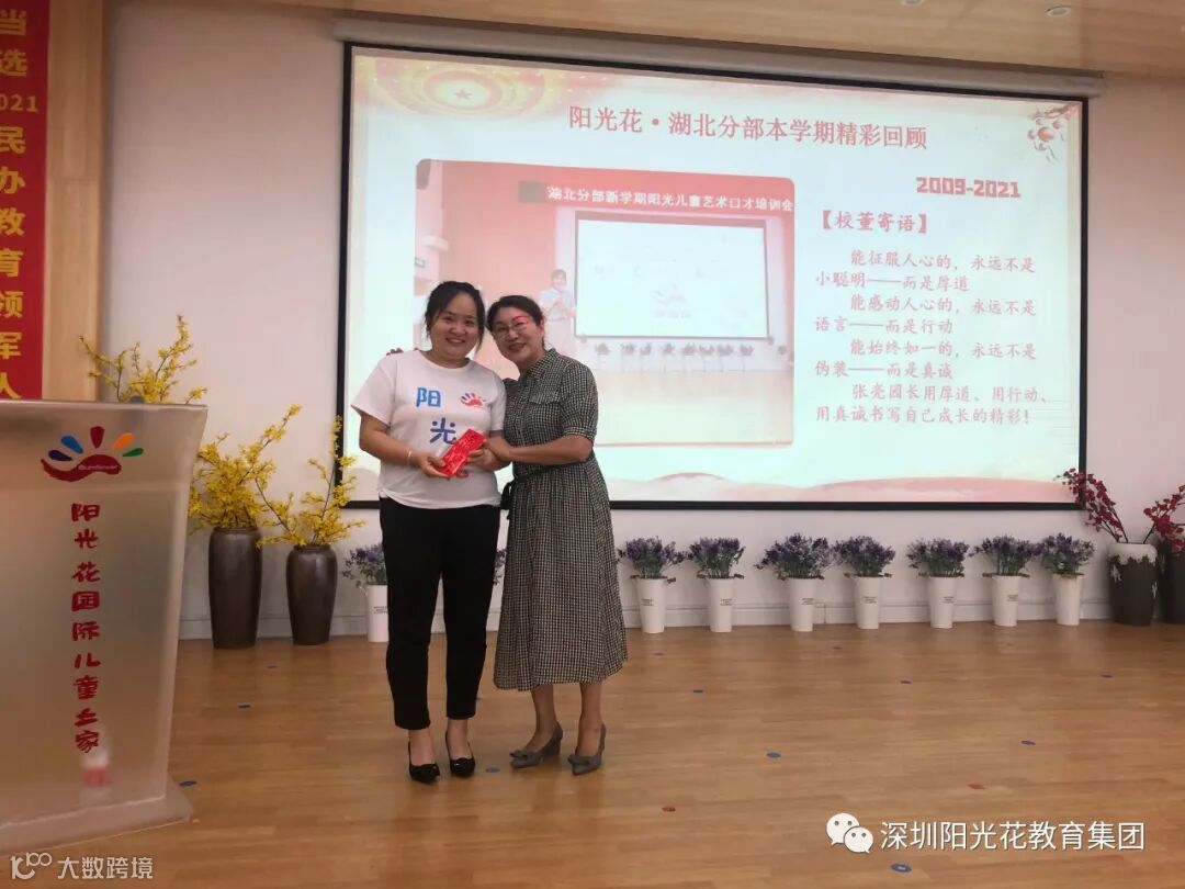 王英校董本次重要讲话中,对湖北分部刘璐园长和张亮园长进行了表彰,感谢她们为阳光花湖北分部行政工作的发展和不断开拓所做出的贡献。