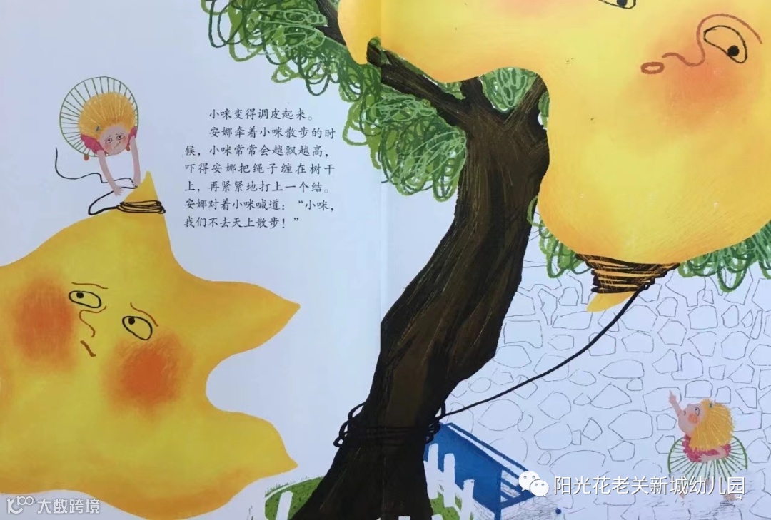 小咪变得调皮起来。安娜牵着小咪散步的时候,小咪常常会越飘越高,吓得安娜把绳子缠在树干上,再紧紧地打上一个结。安娜对着小咪喊道:“小咪,我们不去天上散步!”