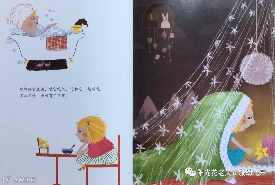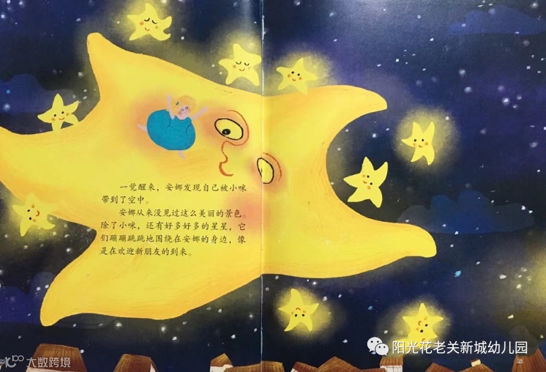 一觉醒来,安娜发现自己被小咪带到了空中。安娜从来没见过这么美丽的景色除了小咪,还有好多好多的星星,它们蹦蹦跳跳地围绕在安娜的身边,像是在欢迎新朋友的到来。