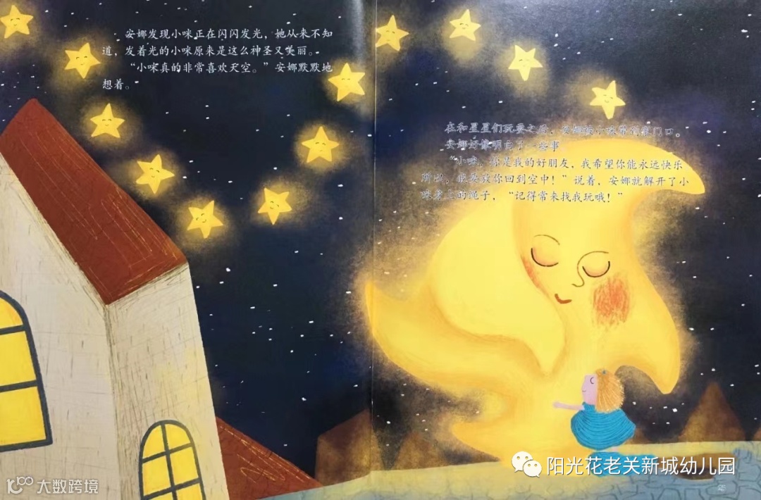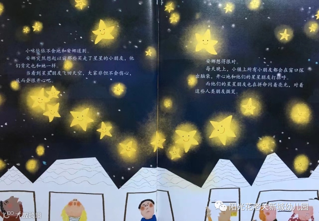 安娜想得很对。每天晚上,小镇上所有的小朋友都会在窗口探出脑袋,开心地和他们的星星朋友打招呼。而他们的星星朋友也在拼命闪着亮光,对着这些人类朋友微笑。