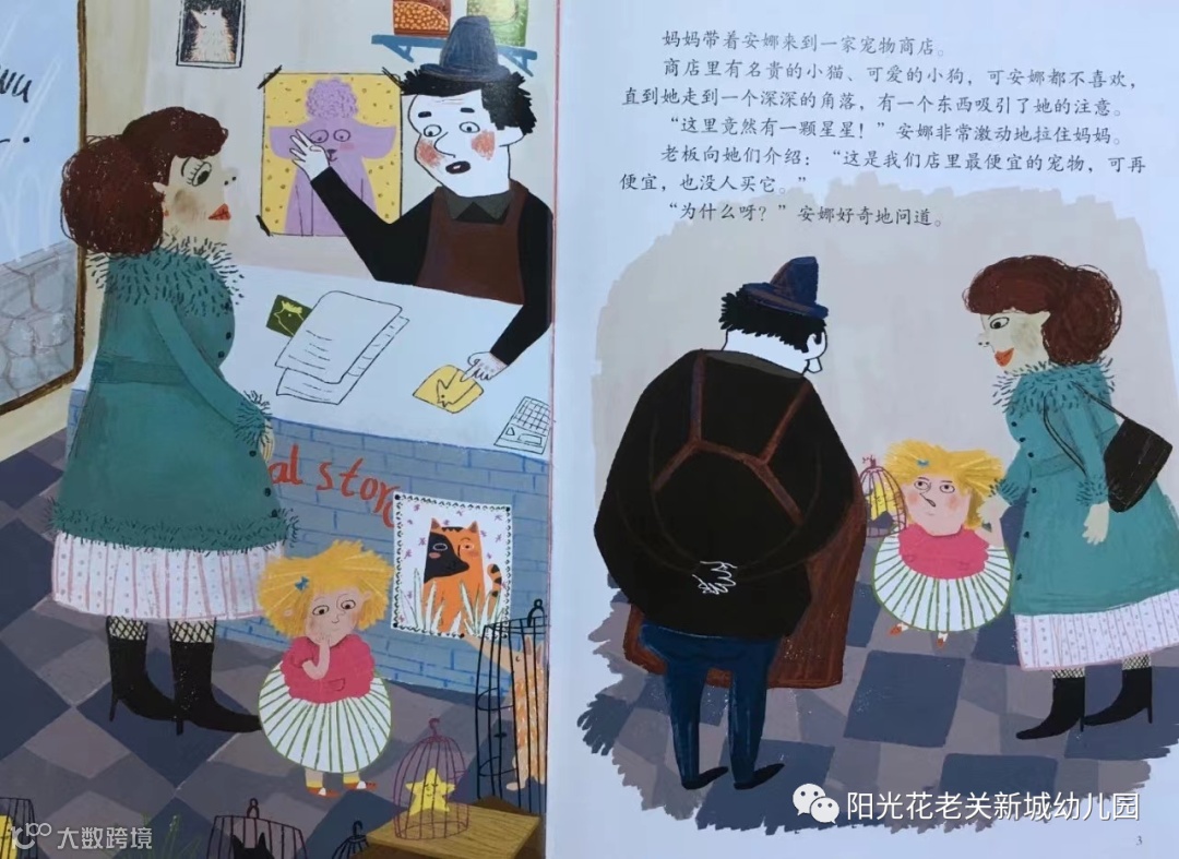 老板告诉安娜,很久以前,小镇上的孩子都很喜欢把星星买来当宠物。可是,星星一到晚上就会逃到天上,饲养星星的小朋友就很伤心。于是慢慢地,小孩子都不养星星了。
