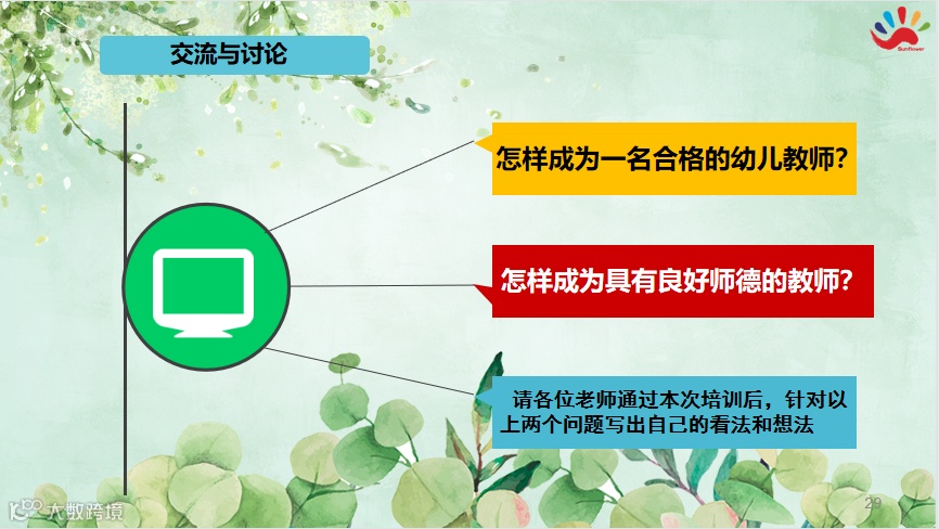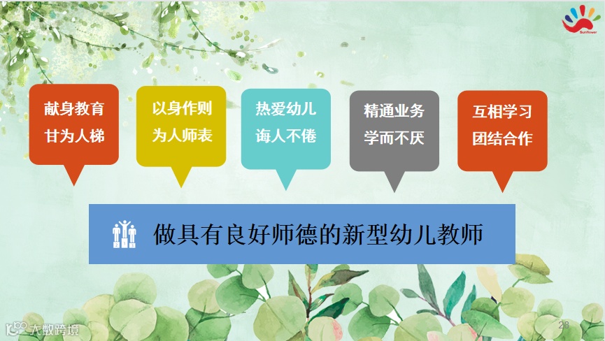 深圳阳光花教育集团教师是立园之本,师德是教育之魂。要达到高质量的教育,必须要有高素质的教师。为不断提高幼儿园师德修养,端正价值观,增强敬业意识、责任意识和服务意识,落实创建积极向上的和谐幼儿园。我园于2021年8月28日下午由刘璐园长组织全体教职工参加师德师风专项培训工作。