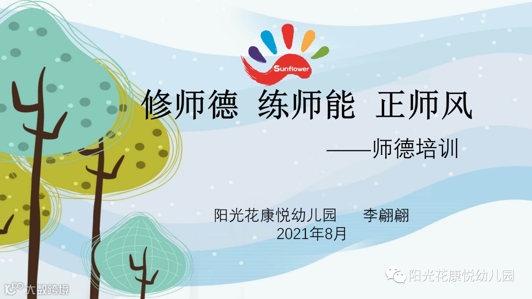 教师是立园之本,师德是教育之魂。要达到高质量的教育,必须要有高素质的教师。为不断提高幼儿园师德修养,端正价值观,增强敬业意识、责任意识和服务意识,落实创建积极向上的和谐幼儿园。我园于2021年8月30日上午由翩翩园长组织全体教职工参加师德师风专项培训工作。