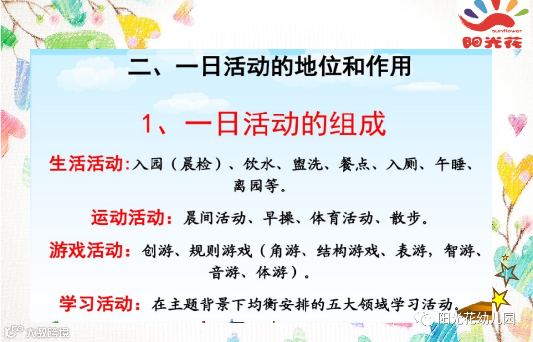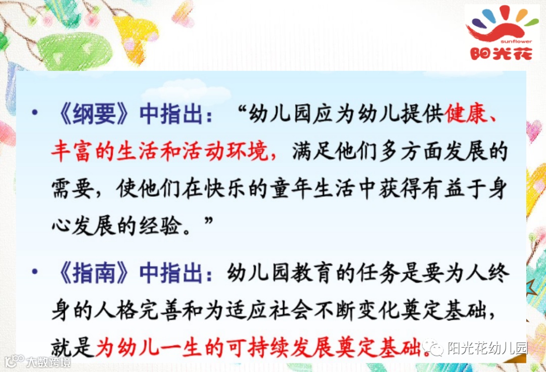 会议伊始,首先一起解读幼儿园一日活动的内涵。一日活动的开展是孩子、老师、家长共同参与的过程,《3—6岁儿童学习发展与指南》中指出要合理的安排一日生活,最大限度地支持和满足幼儿通过直接感知、实际操作和亲身体验获取经验的需要。