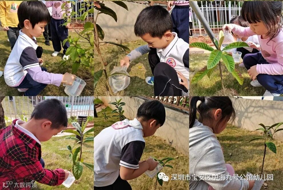 小朋友们拿着早就准备好的小杯子。在老师们的带领下,正在认真地给幼儿园里的树木浇水。他们用自己的行动来证明,自己是一名有爱心的小小护绿员呢!