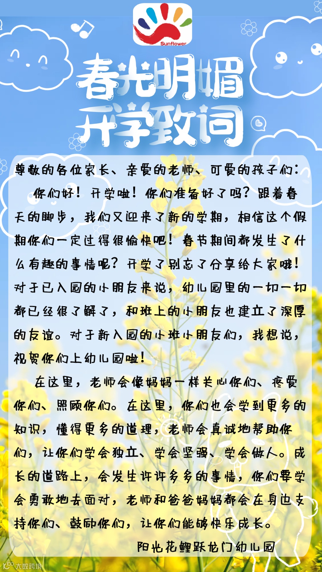 春季是开学季,也是百草回芽之际。全体小朋友们在春的序曲里,和老师一起跳起精彩的舞蹈《幸福快乐阳光花》;