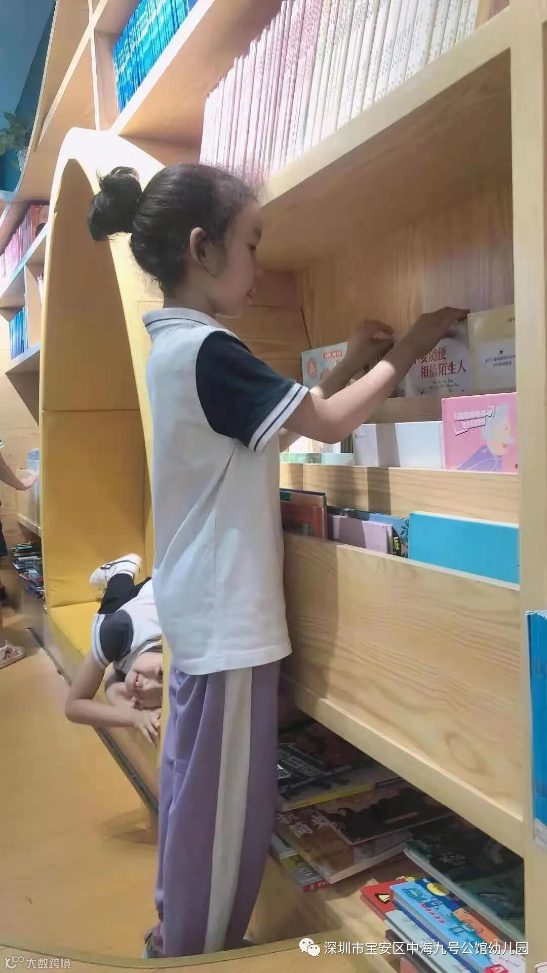 体验了一把小学生的自豪感,紧接着新安中学(集团)外国语学校的老师又带领大班小朋友参观了小学的环境。首先去参观宽敞明亮的教室,听到哥哥姐姐朗朗的读书声,孩子们对上小学和做小学生的愿望更加强烈了,同时他们也切身体会到要成为一名合格的小学生还要在各方面不断努力,对自己提出了更高的要求。看完教室后,我们一起来到了图书馆,小朋友们沉浸在书的海洋里,这感觉太棒了!
