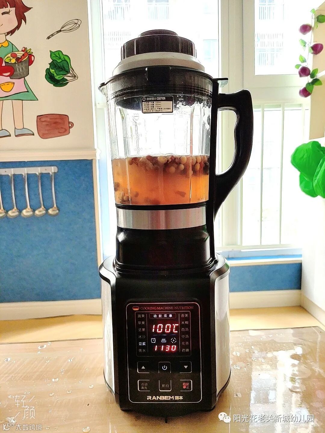 豆浆加热中,孩子们时刻观察杯中的情况。哇!水变颜色了!